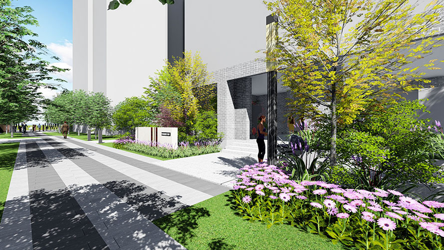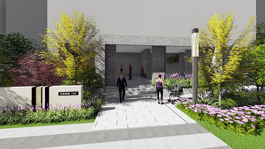 小区入口门楼反应书院气质的内敛与简洁,色调庄重统一。与唐代诗人常建的《题破山寺后禅院》中“曲径通幽处,禅房花木深。”的意境同出一辙。木色与白色的结合,独特的门楼设计形状,带有书院气息,颇具禅意。