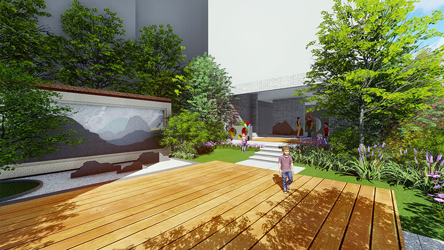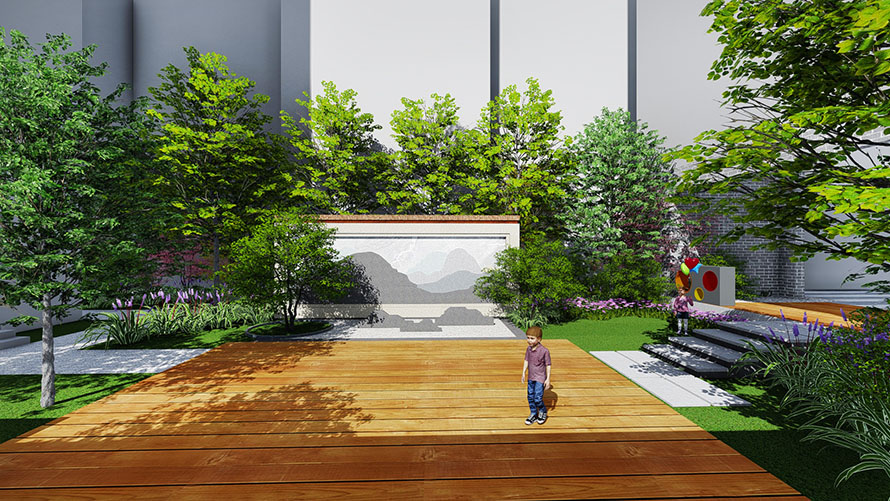 以基础色调为主,不选用彩色叶品种,只用少量花小色淡的开花植物点缀,创造淡雅,简约的景观环境。一年四季都郁郁葱葱的,有可观的、可闻的、可品的。不仅仅赏心悦目,亦可纳荫乘凉,夏日里,树荫斑驳包裹着你,完全沉醉其中。