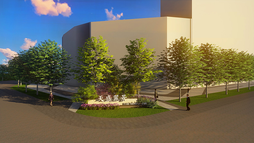 天盛区域建筑空间布局密度较高,设计通过光影及更具视觉冲突感的材质组合,顶部以柔亮光源带点缀,门扉半开迎客的文儒气,将含蓄雅致的文人情怀融入场地,充分利用均匀的巷道空间,营造一种欲显还隐、引人入胜的初始印象,彰显园内住户宁静文雅的品质生活与追求。