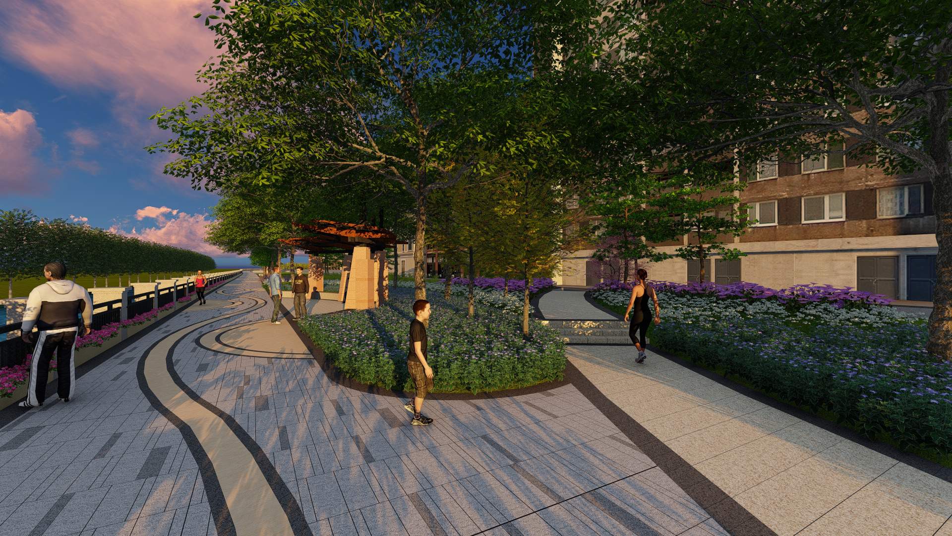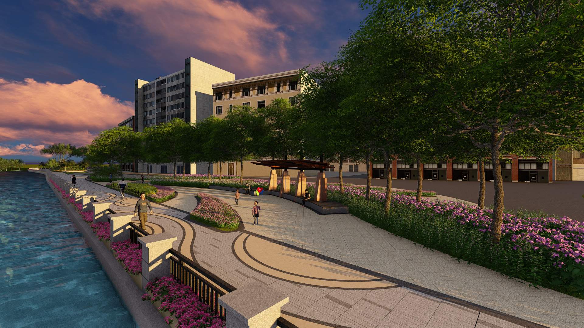 通过以群落式的复合型绿化等多种绿化组团搭配,进行适当的空间塑造,形成层次丰富的植物景观,局部点缀花境类植物。景观构成元素:水、植物。