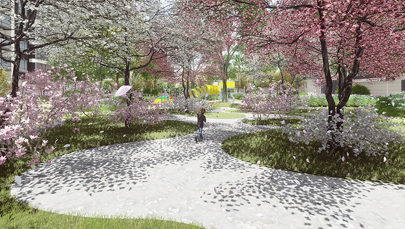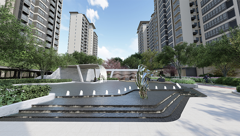 穿越山水景墙,来到温润的阳光铺洒的草坪上,孩童的笑声、老人的皱纹、爱人的亲吻,无一不是现代雅致幸福的生活的象征。设计师让人们于此中找到心归处,之于生活,即是心灵世界的寄托,更是生活美学的折射。