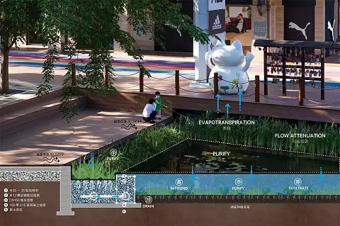 秉持着“基于源头控制、延缓冲击负荷”的雨水设计理念,阿普贝思研发团队力图营建一个与自然地理条件相适应的雨水调蓄装置,借此实现雨水的资源化管理。同时,运用景观化处理手段,使植物与材料成为花园主角,让雨水设施重新焕发生机与活力。