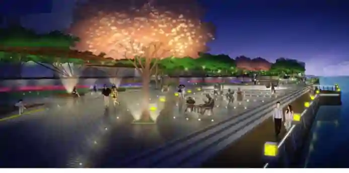 由河流概念衍生出的流线型的地面灯带布置,闪耀在树上的点点星光,沉浸式的“光体验”疗愈城市骄躁情绪,控制光照形状的同时控制影子的形状,展现出光照构筑物的氛围,使得游人进行很好的情绪释放。
